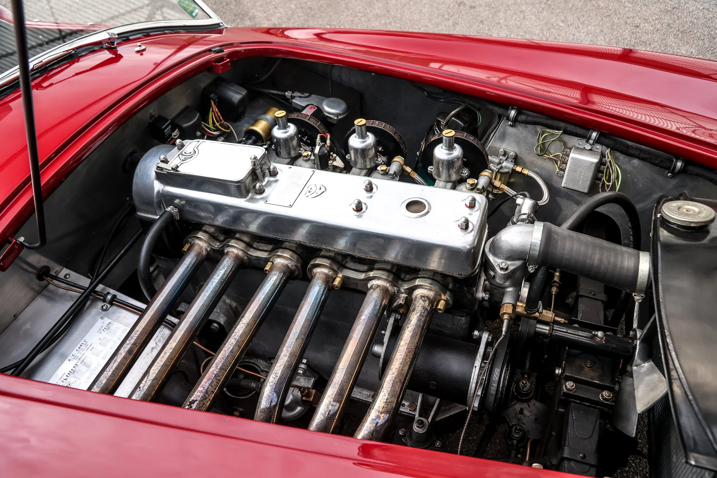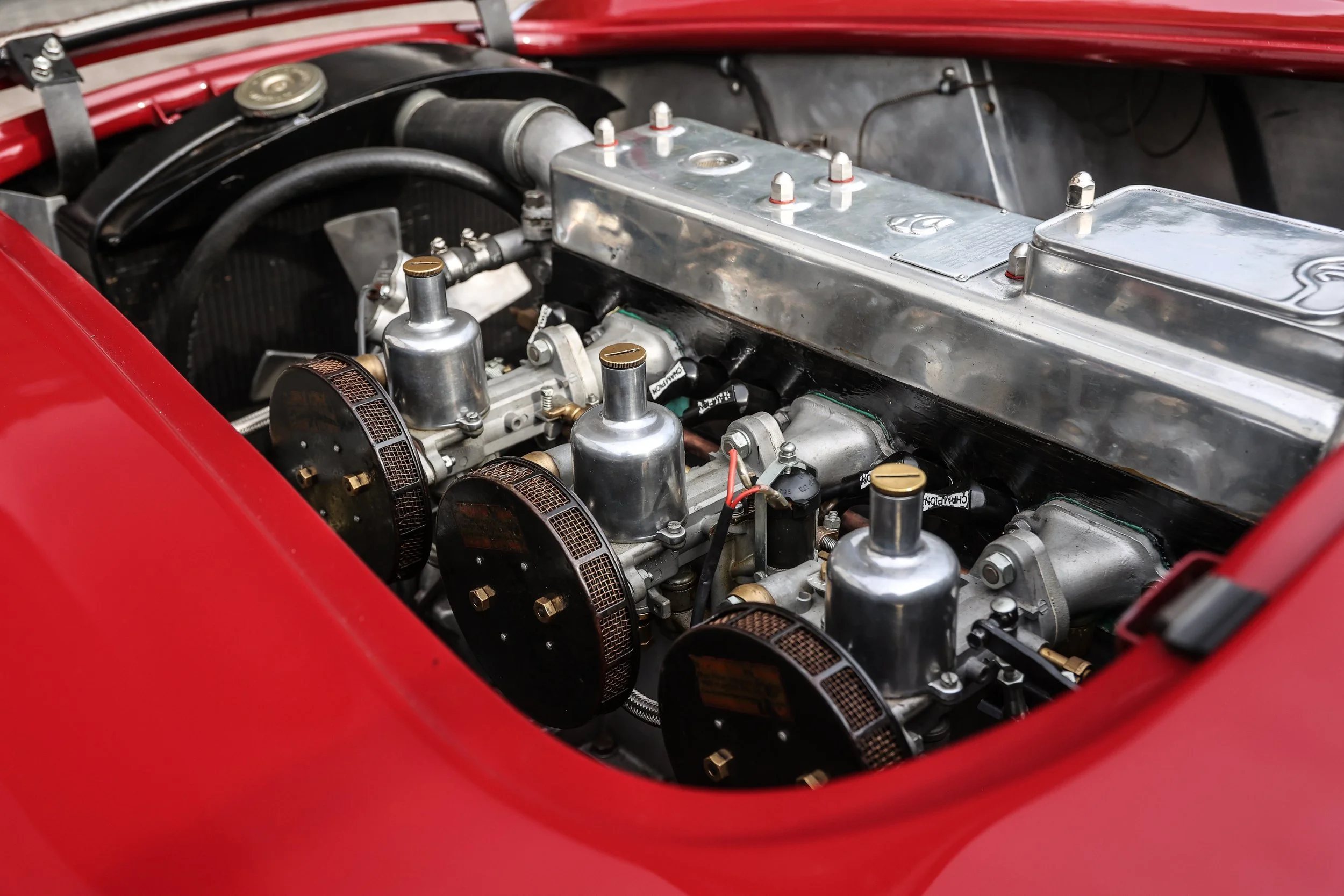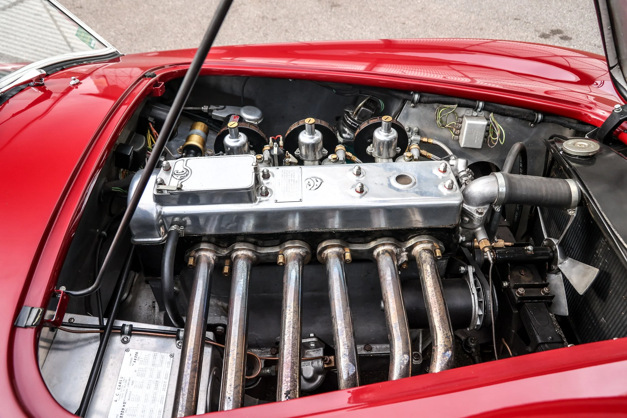 Completed on the 30th of October, 1957, AE 220 was assembled at the AC factory in Thames Ditton and finished in its original and striking shade of Damask Red with a black interior. It was built in right-hand drive configuration and fitted from new with AC’s venerable 1991cc straight-six engine—a powerplant that had proven its mettle in both road and race applications.